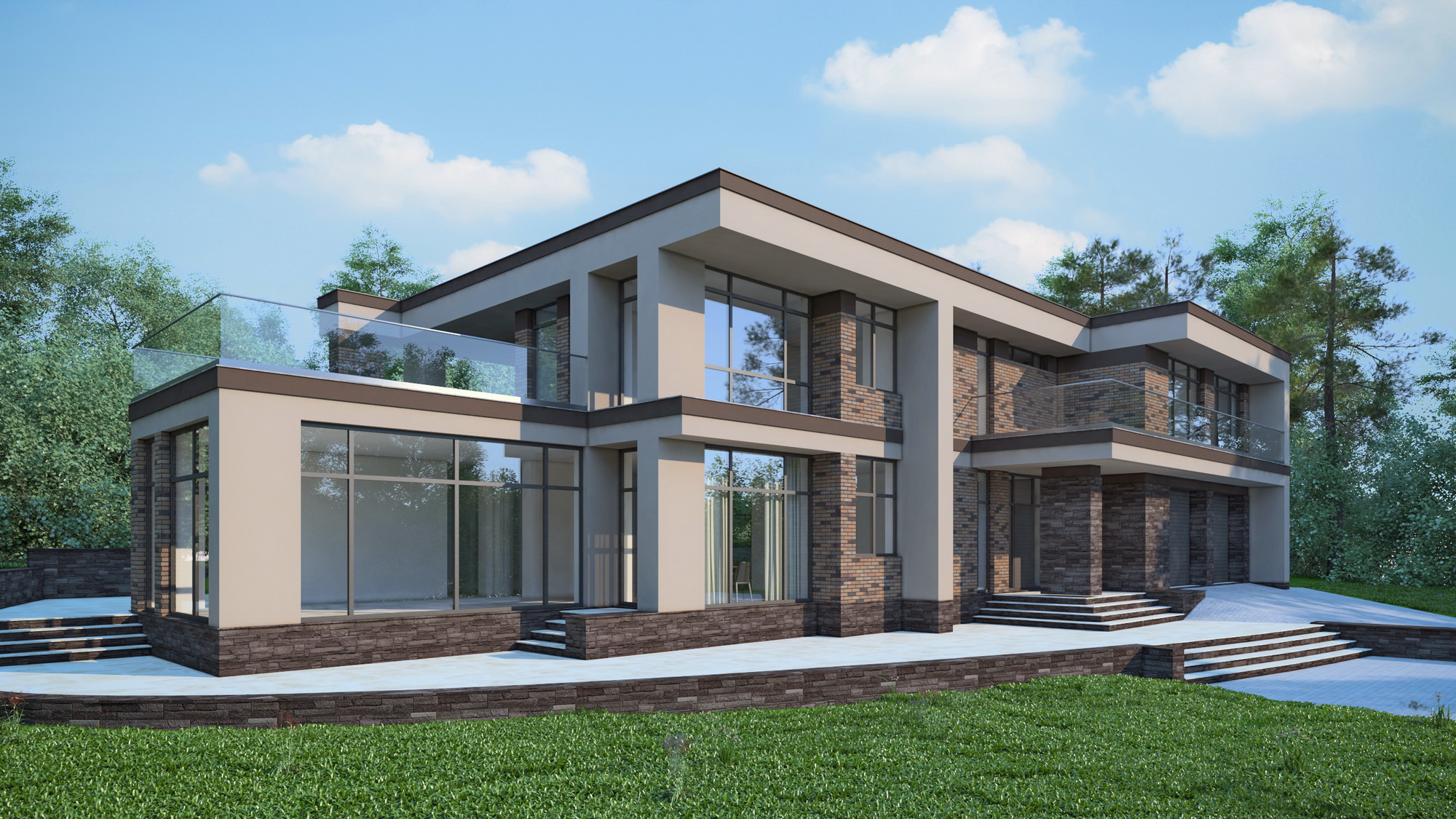 - Внешняя отделка: клинкерная плитка под кирпич, камень, фасадная штукатурка, отделка террас – керамогранит